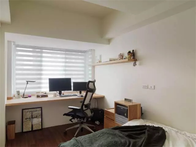 臥室的窗臺下,一個木質(zhì)擱板就成為簡單的書桌,這種做法比放一個現(xiàn)成的桌子更加節(jié)省空間